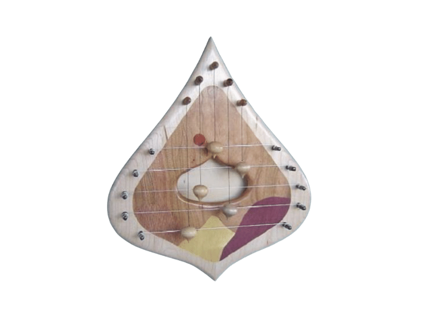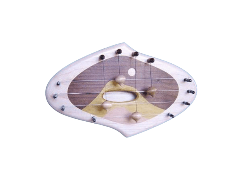 The door harp is a flattened hollow box made from various kinds of hardwood that comes in many different shapes and sizes, with hanging balls that bounce off the strings which are tuned to different notes. The amount of strings can vary from 3 to as many as a dozen (or more!). Traditionally the strings were made of braided silk, however, these days they are usually wire.